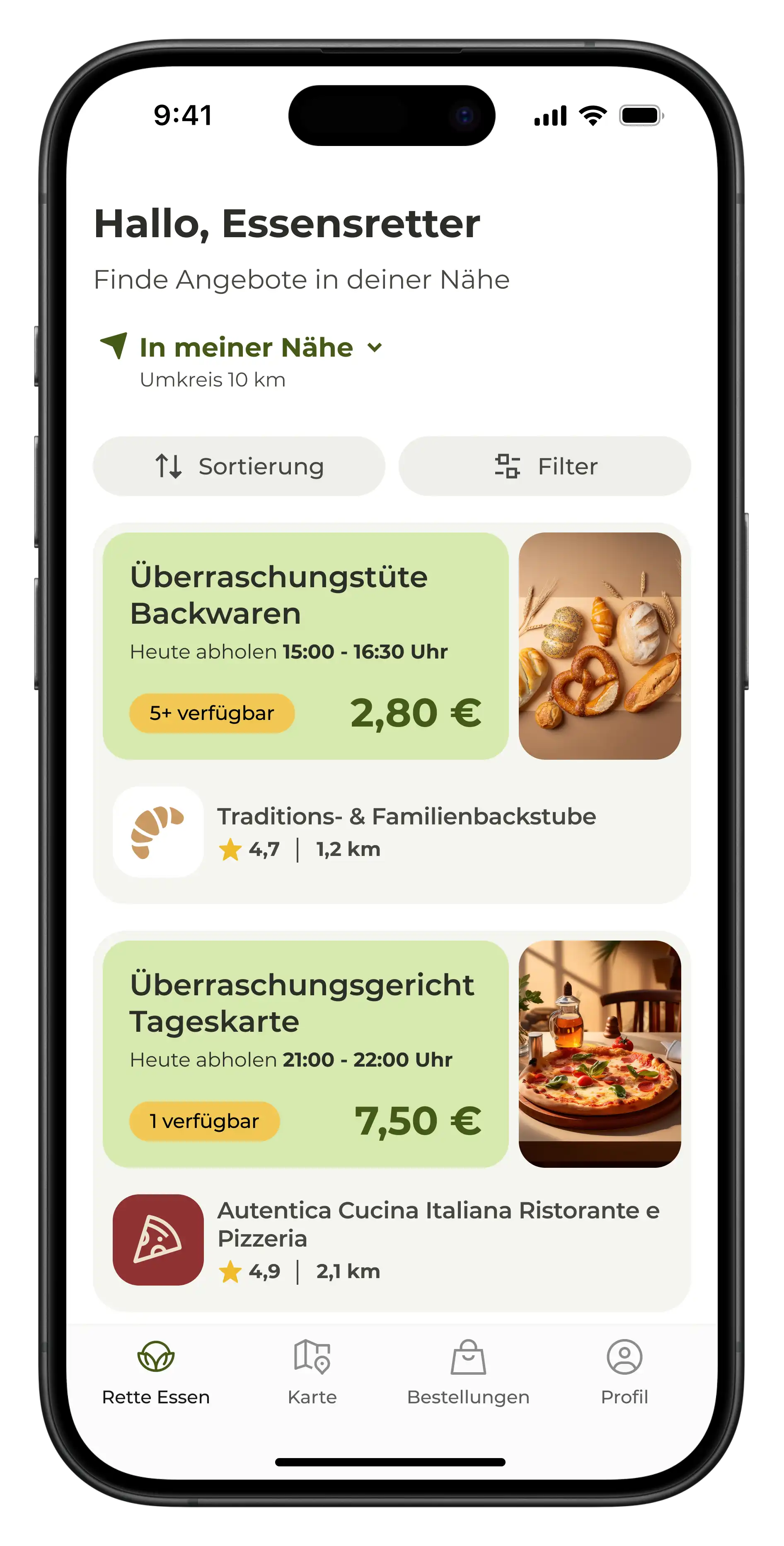 Entdecke überschüssige, aber leckere Lebensmittel, die gerettet werden wollen und wähle deine Überraschungstüte in der saveFOOD App aus.
